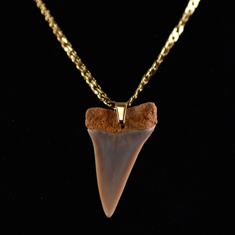 15 million-year-old extinct Broad White shark tooth, unearthed from ancient dried up seabeds in California. Prepared and mounted by hand on an 18K gold plated stainless steel chain & bail.