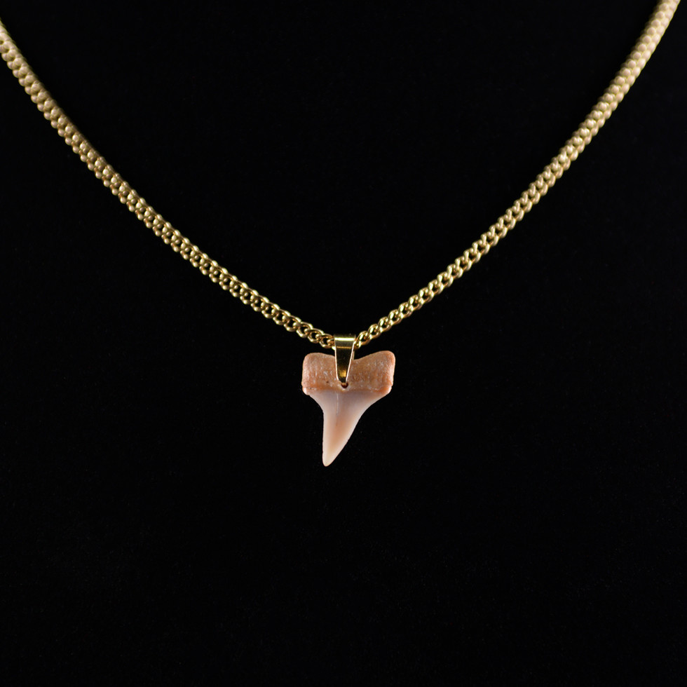 15 million-year-old extinct Broad White shark tooth, unearthed from ancient dried up seabeds in California. Prepared and mounted by hand on a 14K gold plated stainless steel chain & bail.
